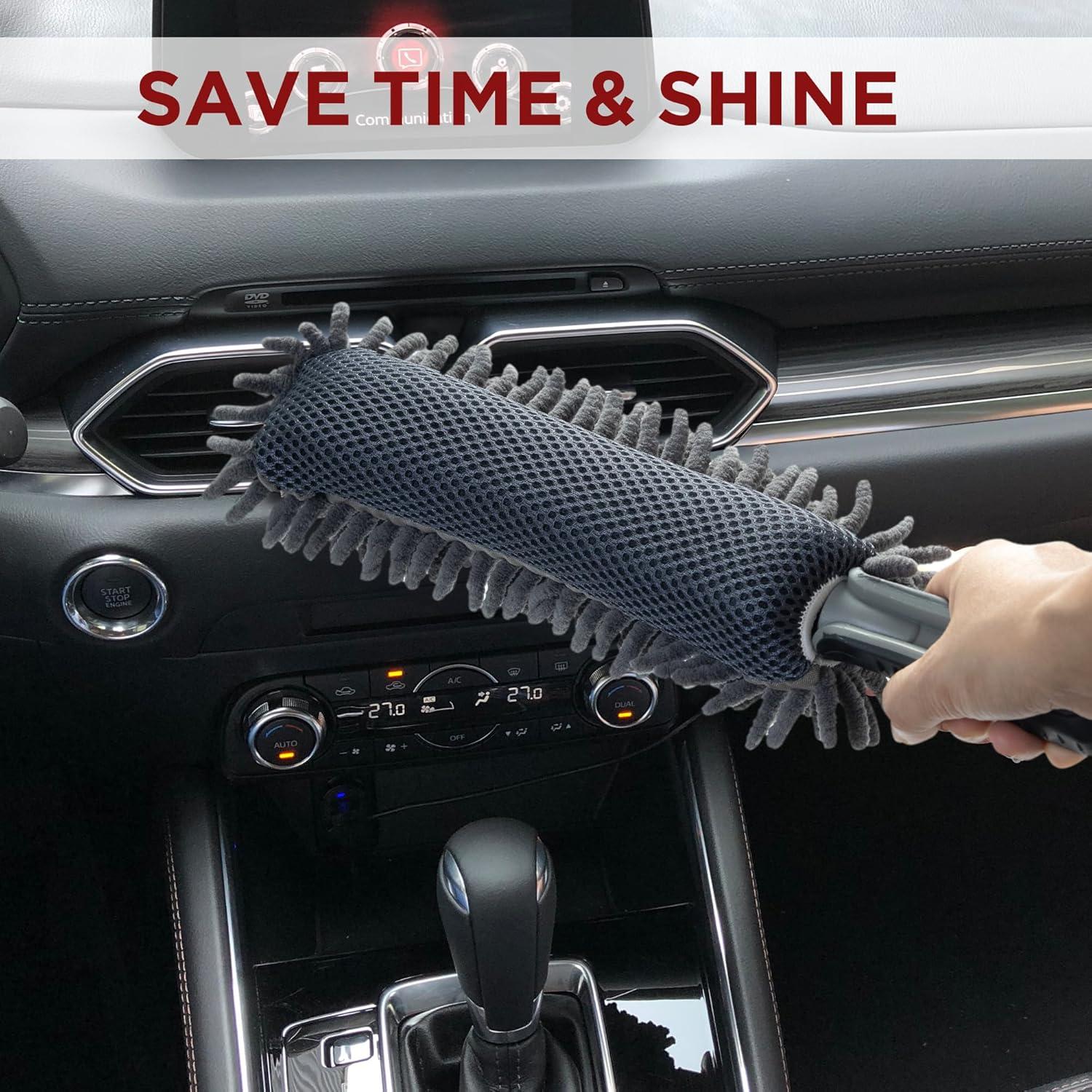Car Duster Interior by TAKAVU, 360° Microfiber Fingers, Unbreakable Comfort Handle, Lint and Scratch Free, Include Microfiber Towel, for Car & Home Use, The Best Auto Accessories Gray(Microfiber Chenille with Towel)