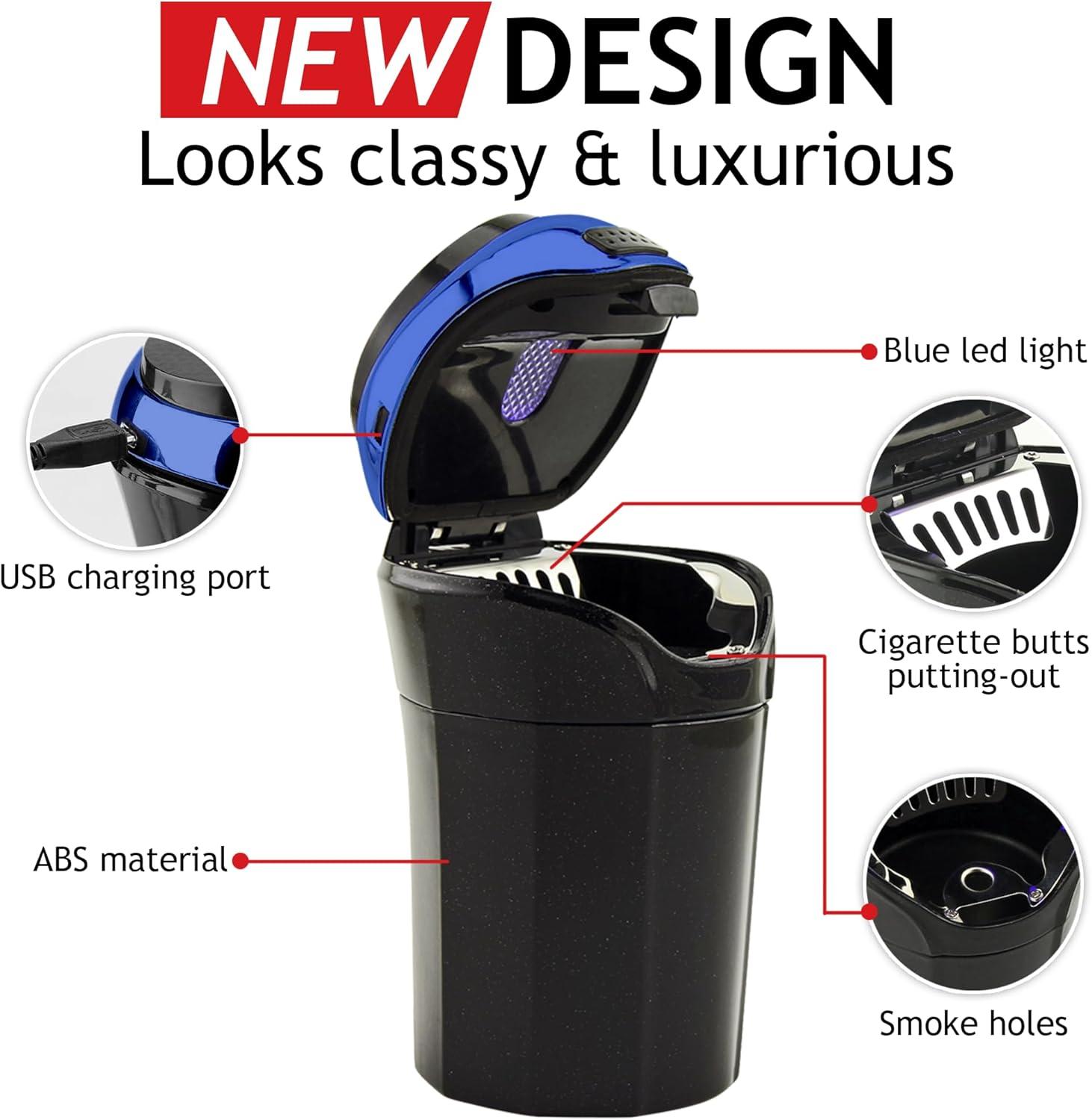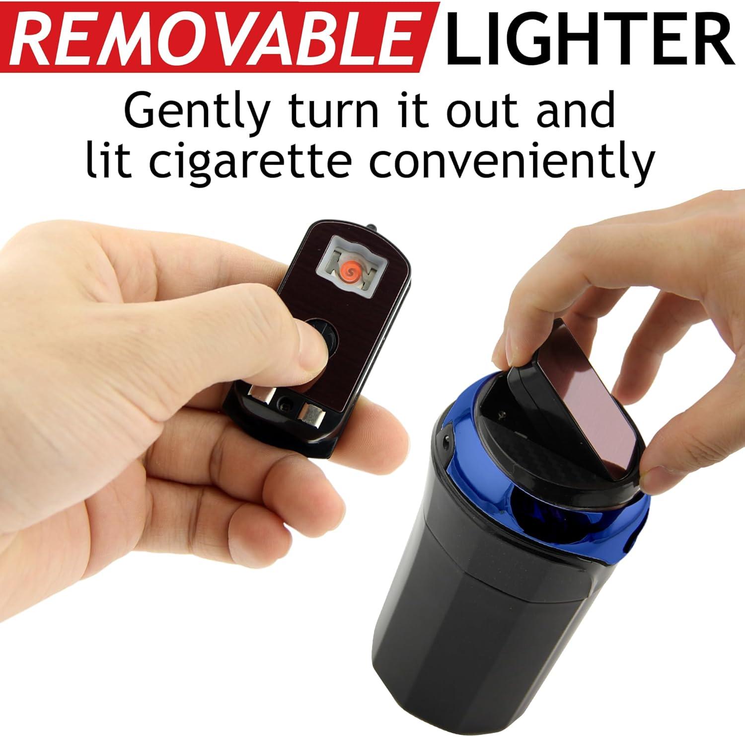 COOL BLUE LIGHT & CIGARETTE LIGHTER: when you open and lift the lid, the ashtray cool blue LED light will light up automotively, increasing night vision and making sure you can see the tray. A removable cigarette lighter included, gently get it out, pressing the lighter switch and lit cigarette in your car conveniently.