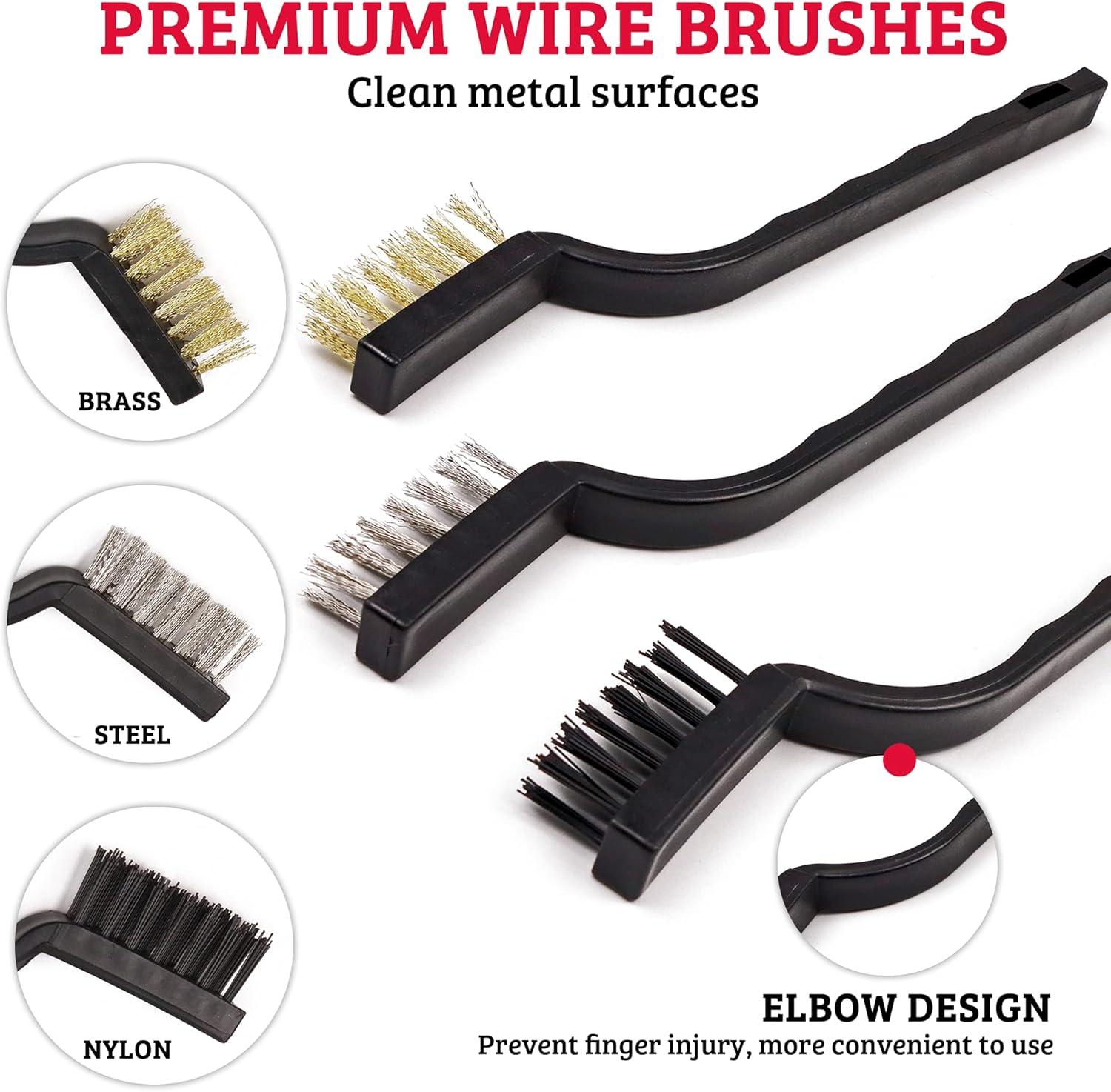 Heavy-duty 3-piece wire brush trio: Includes stainless steel, brass, and nylon wire brushes designed for tough cleaning tasks. Effectively remove rust, corrosion, and stubborn grime from metal surfaces, engine parts, and undercarriages without causing undue damage.