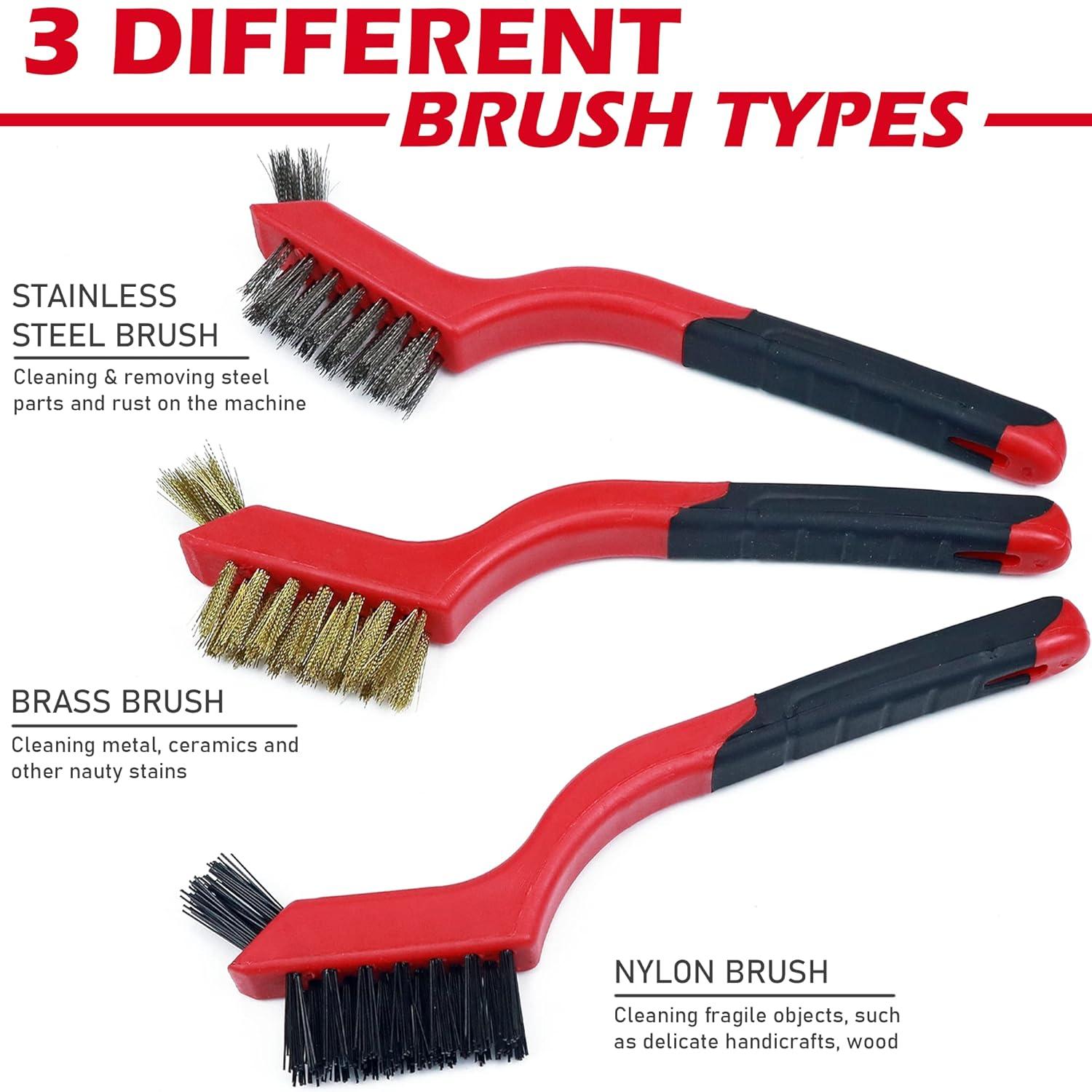 Wire Brush Set – 3 Different Brush Types: The TAKAVU set includes nylon, brass and metal brush heads. The nylon brush is used for gentle cleaning like delicate objects, brass is used for aggressive cleaning like metal surfaces, and metal brush is used for abrasive cleaning to remove rust.